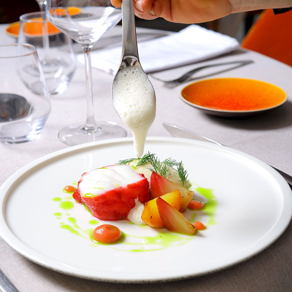 De Méditerranée, le pavé croustillant, jus mousseux au gingembre et combava, riz frit aux petits légumes et chou pak choï