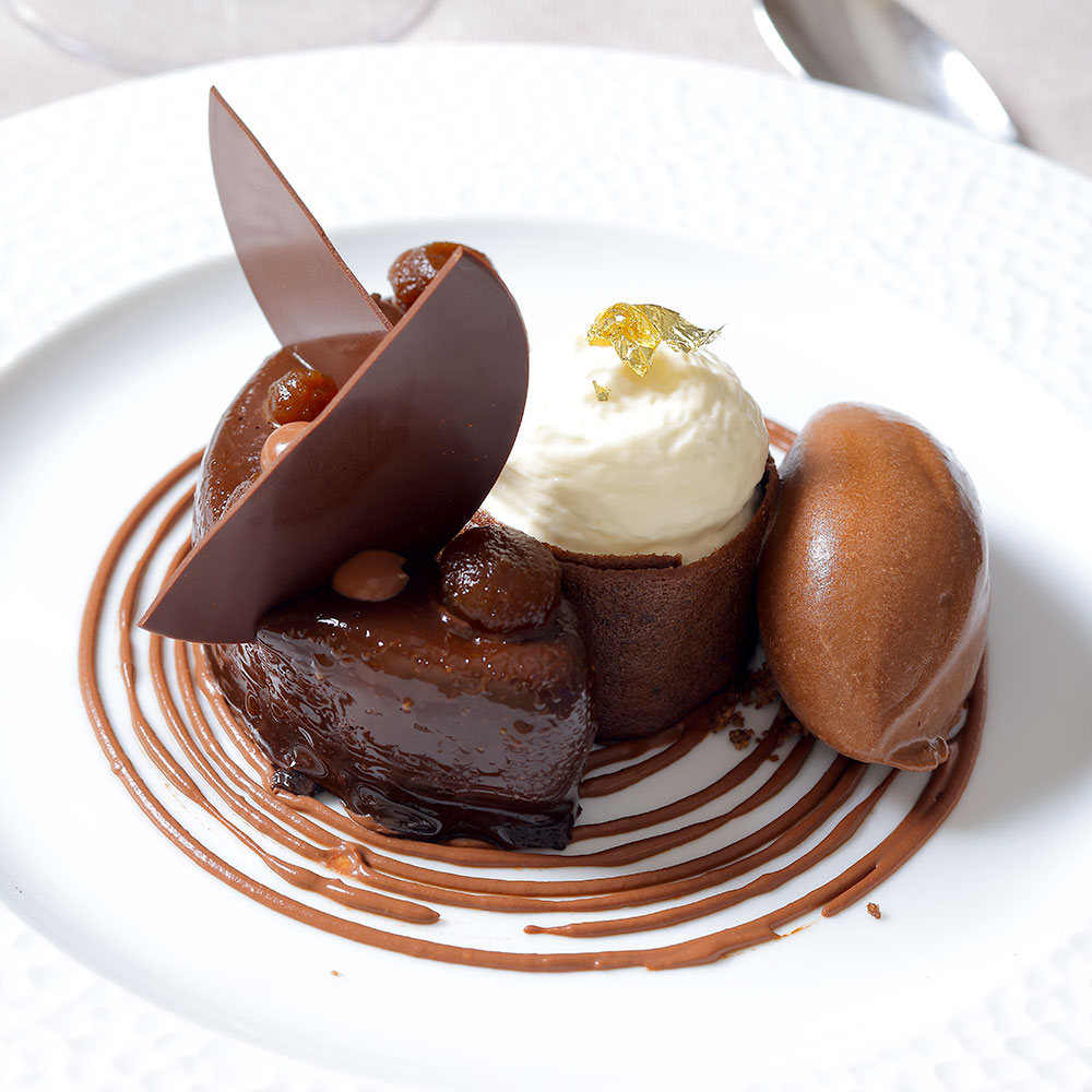 Garni d’un praliné noisette et crème diplomate au chocolat Dulcey, confit et sorbet aux fruits de la passion